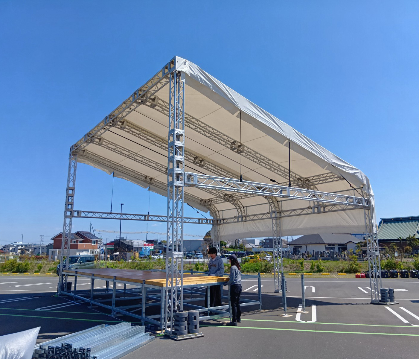 また今回はステージはお客様の方でご用意していただいたので弊社はトラステントのみの設営でしたがステージも所有しておりますので合わせて設営も出来ますし、今回の案件の様にステージは用意できるのでトラステントのみの対応をお願いしたいという事も可能なので色々ご相談ください。